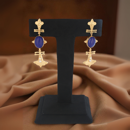 Description:A graceful fusion of deep royal blue, shimmering gold, and classic pearl tones, this necklace exudes elegance with a subtle contemporary twist. The design centers on bold blue beads adorned with delicate gold line patterns, alternating with ornate gold filigree beads. Soft pearl-like beads frame the focal segment, adding a...