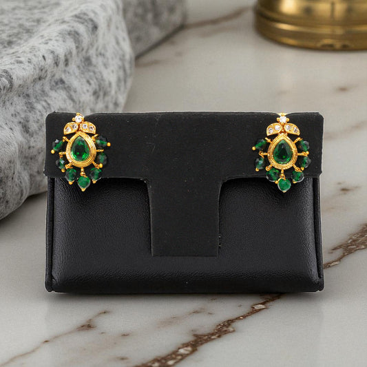 Product Details: Type: Stud Earrings Base Material: Alloy with Gold-Tone Finish Main Stone: Emerald Green Teardrop-Cut Glass Stone Accent Stones: Clear Round White CZ Crystals & Faceted Green Beads Design Motif: Royal/Floral-Inspired Cluster Color: Gold with Emerald Green and White Crystals Size: Small to Medium (visually estimated around 1 inch)...