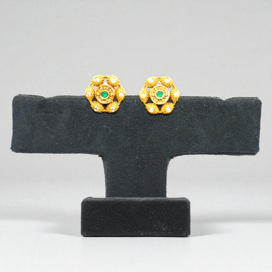 Product Details: Type: Stud Earrings Base Material: Brass Alloy with Antique Gold Finish Design: Traditional Floral Motif with Starburst Pattern Stone Details: Center: Round Green Stone (Glass or Faux Emerald) Surrounding: White CZ (Cubic Zirconia) Stones Color: Antique Gold with Green and White Accents Size: approx. 1 inch diameter Closure...