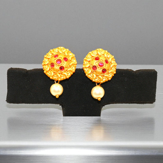 Product Details: Type: Stud Earrings with Drop Material: Alloy with Antique Matte Gold Finish Design Highlights: Intricate floral circular stud Embellished with ruby-red stones arranged in a traditional circular motif Beautifully textured leafy pattern surrounding the center Dangling cream pearl drop for added elegance Stones: Red (ruby-toned glass/Kundan-style) Drop: Faux...