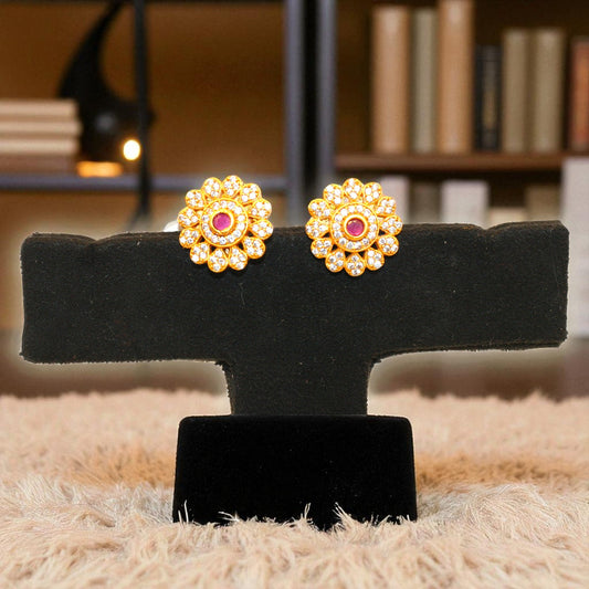 Product Details: Type: Stud Earrings Material: Alloy with Gold Plating Design: Floral-inspired circular stud design Centerpiece: Green round stone at the center Inner ring: Pink stones forming a floral layer Outer ring: Clear white stones (American diamonds or CZ) Color Palette: Green (center) Pink (middle) White (outer layer) Gold-tone base...
