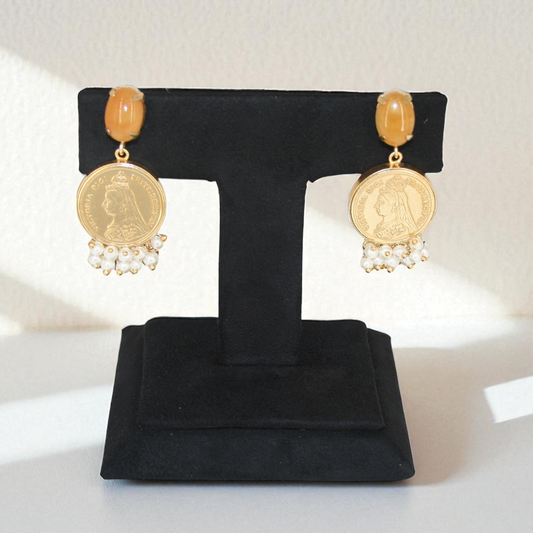 "Dangle into timeless elegance! ✨These exquisite earrings feature vintage-inspired coins and delicate pearl accents, topped with a beautiful amber-hued stone.A true statement piece! 💖"