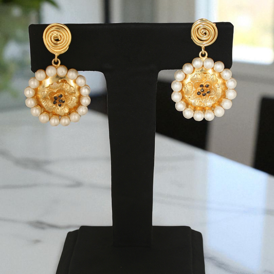 ✨ Elegant & Playful Charm ✨These stunning earrings feature a golden floral center 🌸 surrounded by a delicate ring of pearly beads 🤍, hanging gracefully from a spiral gold stud 🔄A perfect fusion of traditional elegance and modern flair 💫 — ideal for festive vibes, casual glam, or artsy evenings...