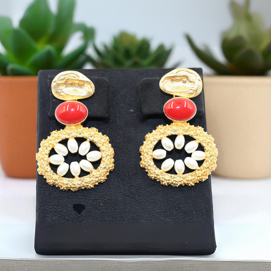 ✨ Make a dashing statement with these stunning earrings! ✨🔴 Stunning red studs meet radiant gold circles 💫🌸 Intricate floral detailing with a dainty pearl center 🤍Perfect for festive vibes or glam evenings! 🌟💃