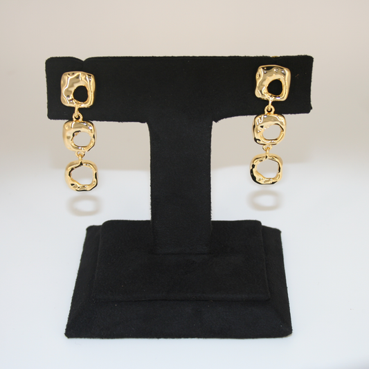 Product Description: Radiate elegance and charm with these Golden Halo Triple Drop Earrings, a sophisticated blend of texture, light, and motion. These earrings feature a three-tiered design that begins with a gold floral stud adorned with a pearl center, offering a classic yet eye-catching appeal. Suspended below is a round,...