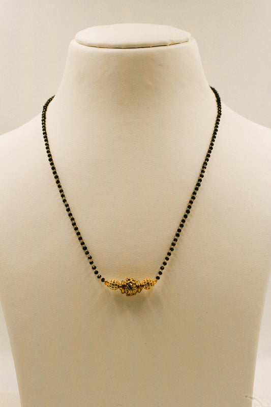 Description: Embrace "quiet luxury" with this modern take on a sacred tradition. This Mangalsutra swaps a traditional heavy pendant for a sophisticated arrangement of golden orbs. At its heart lies a large, intricate filigree sphere that dances with light, flanked by two polished gold spacers and two smaller textured beads....