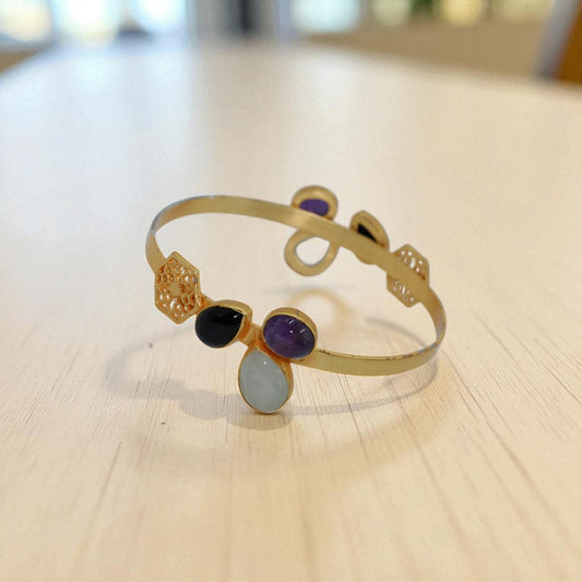 Product Description: Add a touch of artistic elegance to your ensemble with this handcrafted gold-plated bangle. Adorned with smooth cabochon-style gemstones in shades of purple, black, and milky white, this piece brings a perfect balance of traditional charm and contemporary style. Two intricately cut hexagonal filigree motifs add a unique...