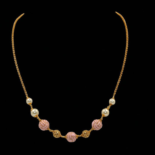 Description:This elegant single-strand necklace offers a fresh and charming combination of soft pastels and rich gold accents. The design features a fine gold-toned chain adorned with lustrous ivory pearls, intricately crafted gold filigree beads, and distinctive pink enamel-patterned beads. The harmonious blend of textures and colors makes it a versatile...