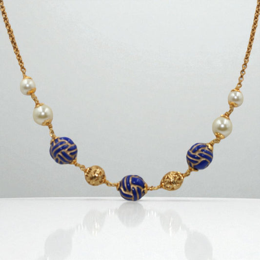 Description:A graceful fusion of deep royal blue, shimmering gold, and classic pearl tones, this necklace exudes elegance with a subtle contemporary twist. The design centers on bold blue beads adorned with delicate gold line patterns, alternating with ornate gold filigree beads. Soft pearl-like beads frame the focal segment, adding a...