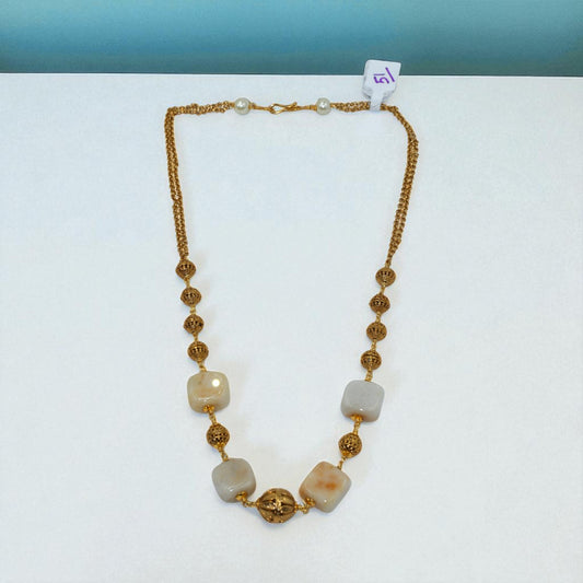 Description:Elegant and understated, this necklace pairs the warm sheen of gold filigree beads with the natural beauty of cream-toned square stones. The smooth, polished stones display subtle beige and amber marbling, giving each bead a unique, organic charm. Interspersed with intricately detailed gold-toned beads, this design offers a refined yet...