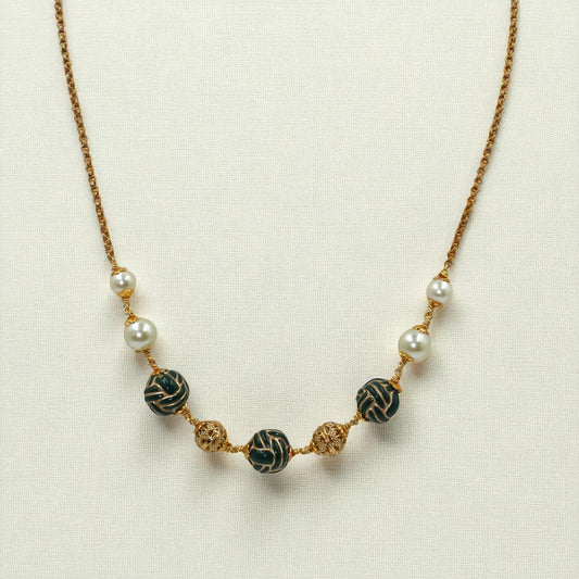 Description:This refined necklace blends the timeless allure of pearls with the rich sophistication of green enamel and ornate gold filigree beads. The design features a delicate gold-toned chain adorned with smooth ivory pearls, intricately crafted gold filigree beads, and deep green enamel-patterned beads, creating a balanced and elegant look. Its...