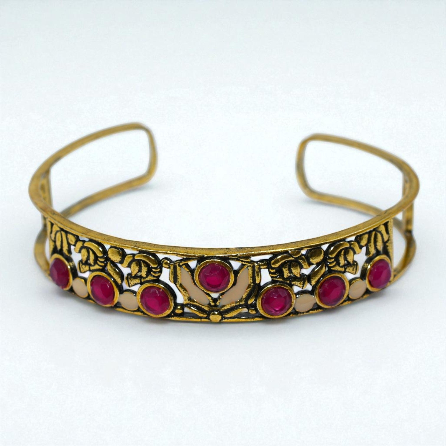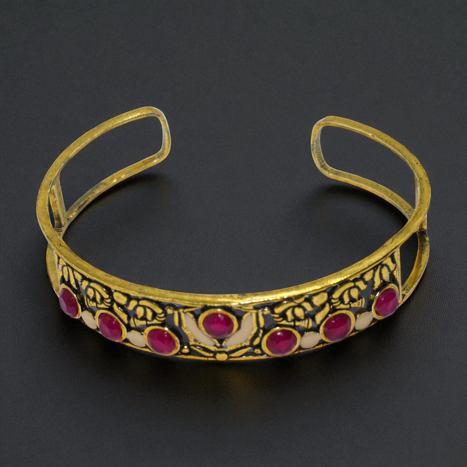 Step into timeless elegance with this antique-style gold cuff bracelet, featuring intricate floral engravings and vivid red stone embellishments. The design combines vintage charm with bold character, making it an exquisite piece for traditional and festive outfits. The open cuff design ensures a comfortable fit, while the floral motif and deep red accents bring a rich, regal touch to your jewelry collection.