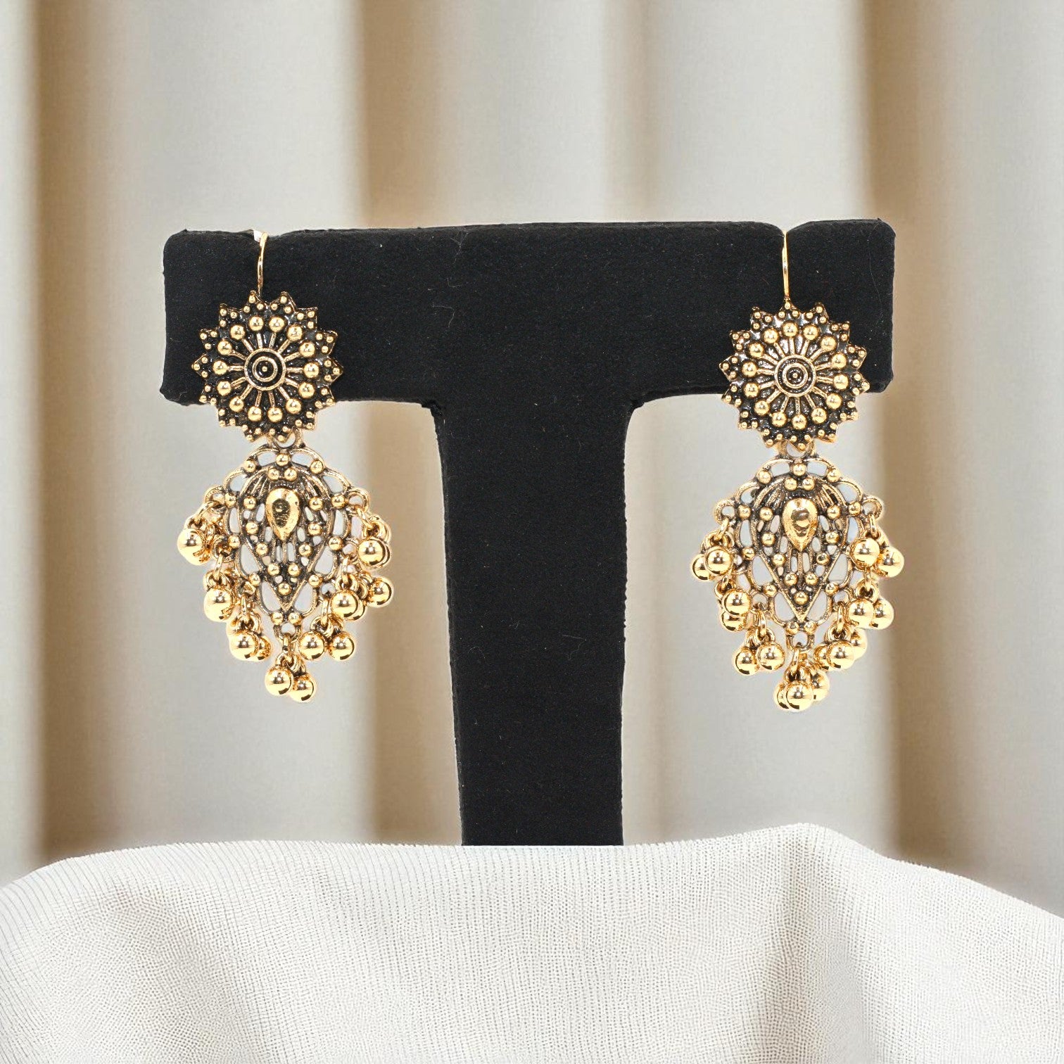 Add a regal touch to your ensemble with these beautifully crafted Antique Gold-Plated Filigree Chandelier Earrings. Featuring an intricate floral stud top, these earrings cascade down into a detailed teardrop-shaped filigree pattern, adorned with multiple tiny gold-toned beads that sway gracefully with movement. The antique finish gives them a vintage appeal, making them perfect for traditional events, festive celebrations, or ethnic-inspired fashion statements.