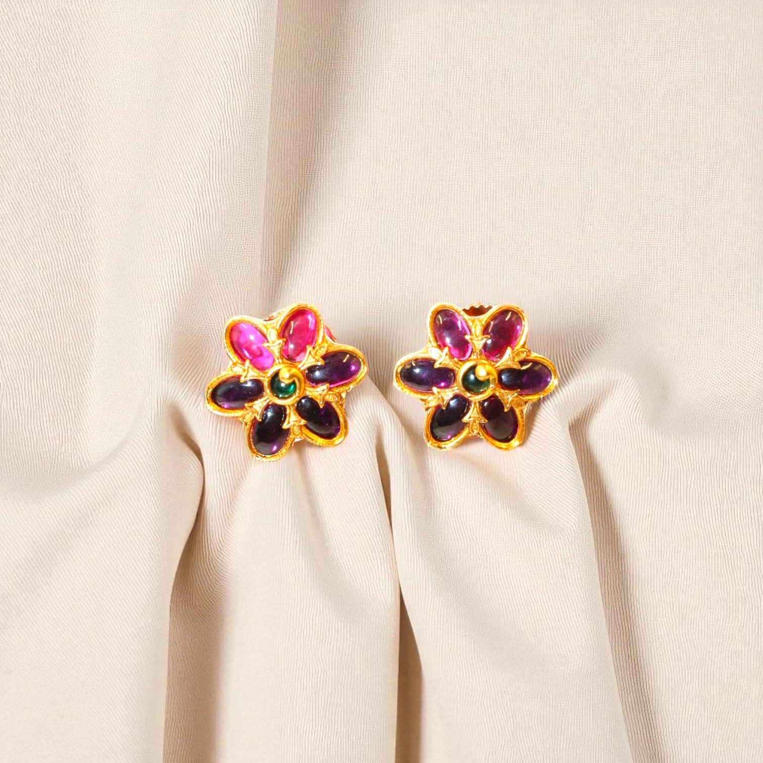 Delicate and vibrant, these Purple Meenakari Floral Stud Earrings are a perfect blend of tradition and simplicity. Crafted in a charming six-petal floral design, each petal is filled with rich magenta and deep purple enamel, showcasing classic Meenakari artistry. A tiny green stone at the center adds just the right pop of contrast, giving the earrings a refreshing appeal.