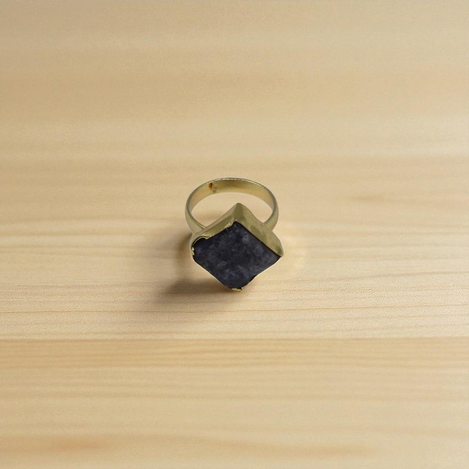 Make a bold statement with this handcrafted ring featuring a raw, uncut amethyst-textured stone set in a rich gold-tone band. The stone's natural texture and deep purple hue create an earthy yet elegant vibe, perfect for those who love organic, boho-inspired jewelry. The square-shaped stone is set diagonally for an eye-catching look, while the adjustable band ensures a comfortable fit for all.