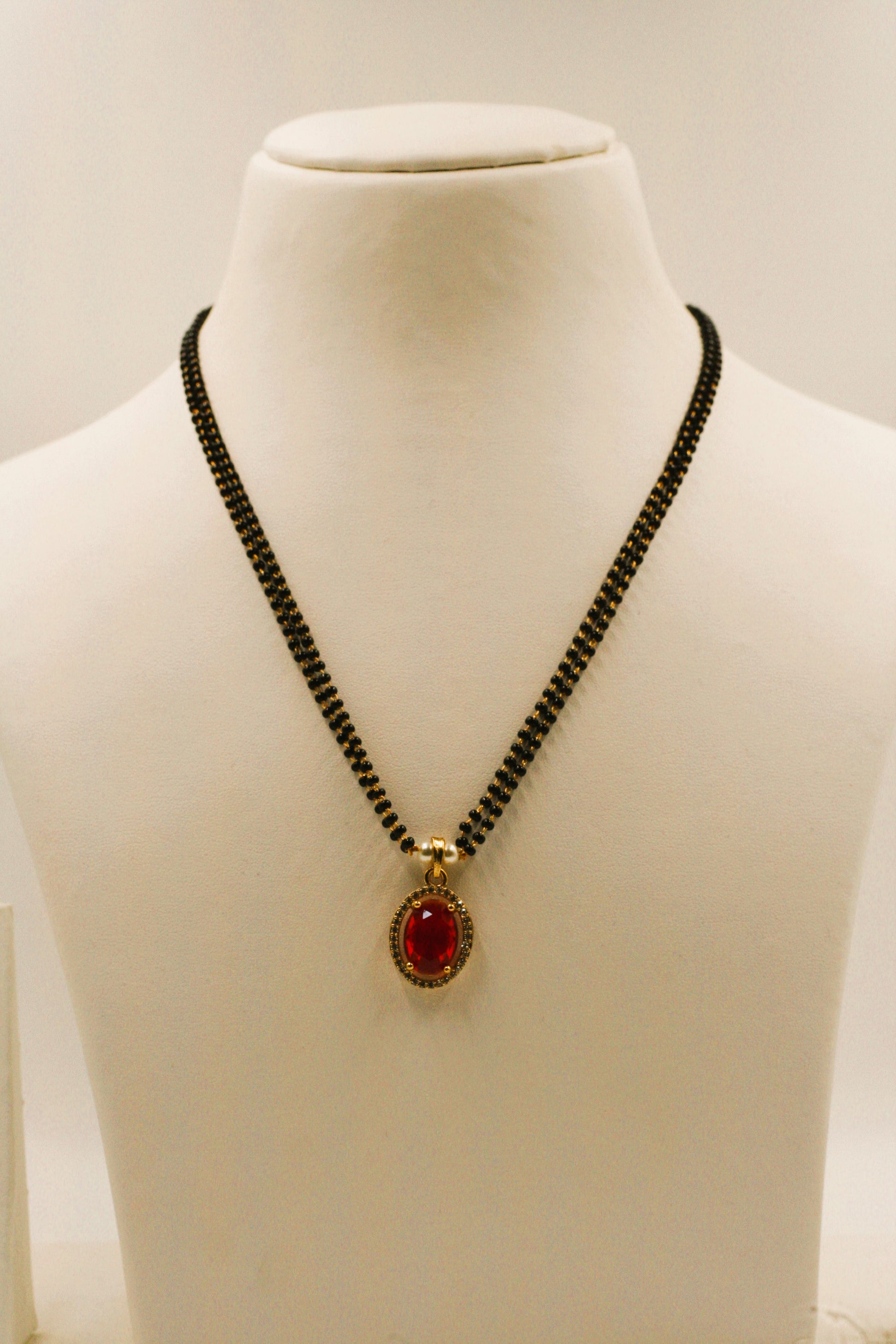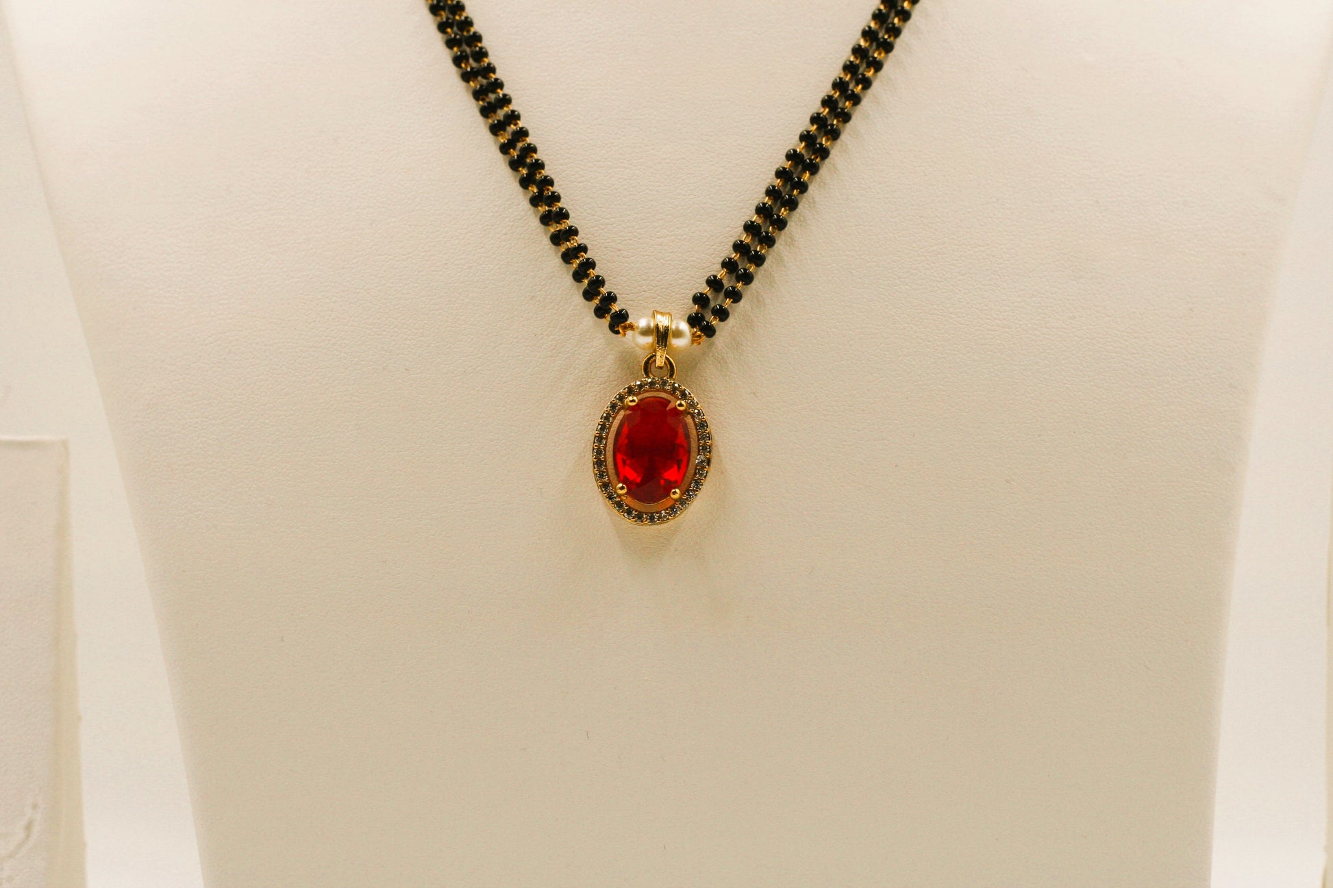 Description: Make a sophisticated statement with this striking double-strand Mangalsutra. Featuring a vibrant, oval-cut ruby-red stone, this piece is designed for those who love bold traditional colors with a royal finish. The pendant is encircled by a delicate halo of gold-toned detailing and crowned with a single, elegant pearl, suspended from two parallel rows of classic black beads for a layered, luxurious look.